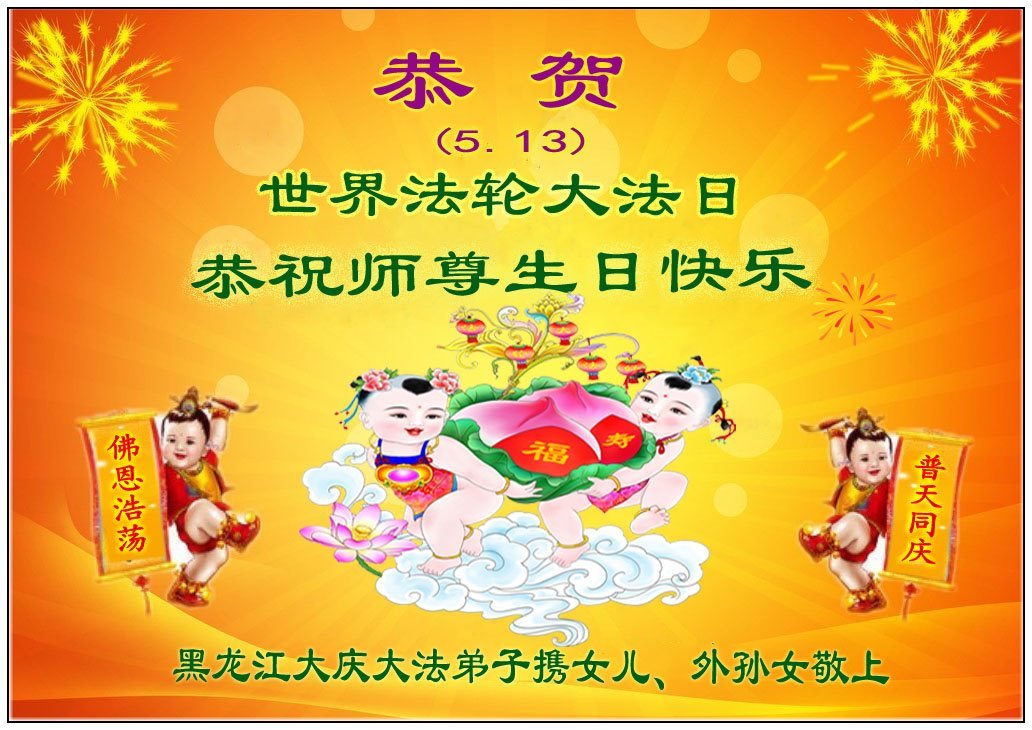 黑龙江省大庆大法弟子携女儿、外孙女恭祝慈悲伟大的师尊生日快乐!恭贺世界法轮大法日!