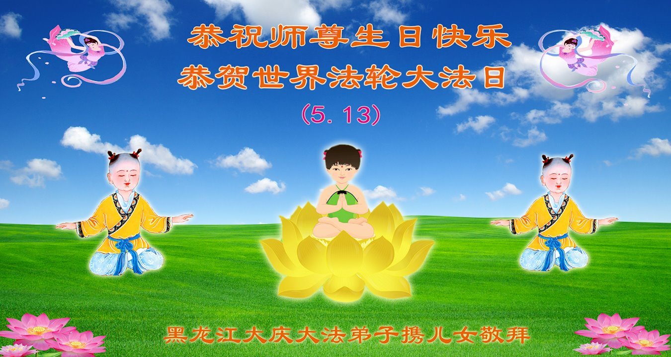 恭祝慈悲伟大的师父生日快乐!恭贺世界法轮大法日! 黑龙江省大庆大法弟子携儿女敬上 黑龙江省大庆市一大法弟子恭贺世界法轮大法日!