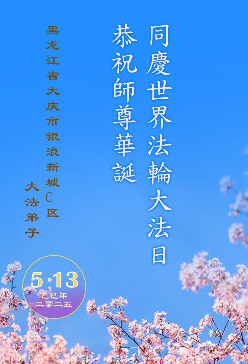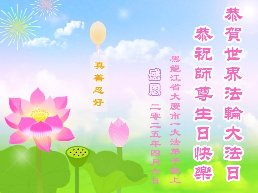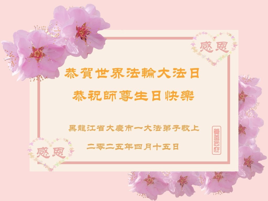 恭祝师尊生日快乐!恭贺世界法轮大法日! 弟子跟随师父正法修炼二十多年,在今年师父的生日里,迎来了普天同庆的这一天,这是全宇宙众生盼望已久的,祝愿师父生日快乐!弟子们唯有继续做好该做的三件事,以报师恩! 黑龙江省大庆市新站镇全体大法弟子敬上 二零二五年五月一日 黑龙江省大庆市大法弟子庆贺5.13世界法轮大法日!