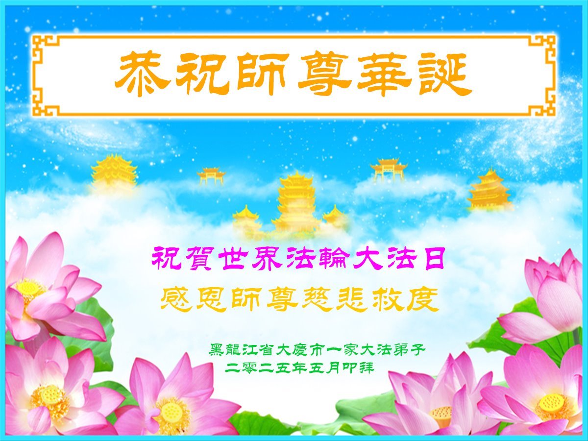 恭贺世界法轮大法日! 黑龙江省大庆市一大法弟子敬上 二零二五年四月三十日 黑龙江省大庆市大法弟子一家三口恭贺世界法轮大法日!恭祝师尊华诞!