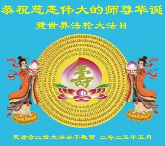 天津市二位大法弟子恭贺世界法轮大法日!恭祝慈悲伟大的师尊华诞!