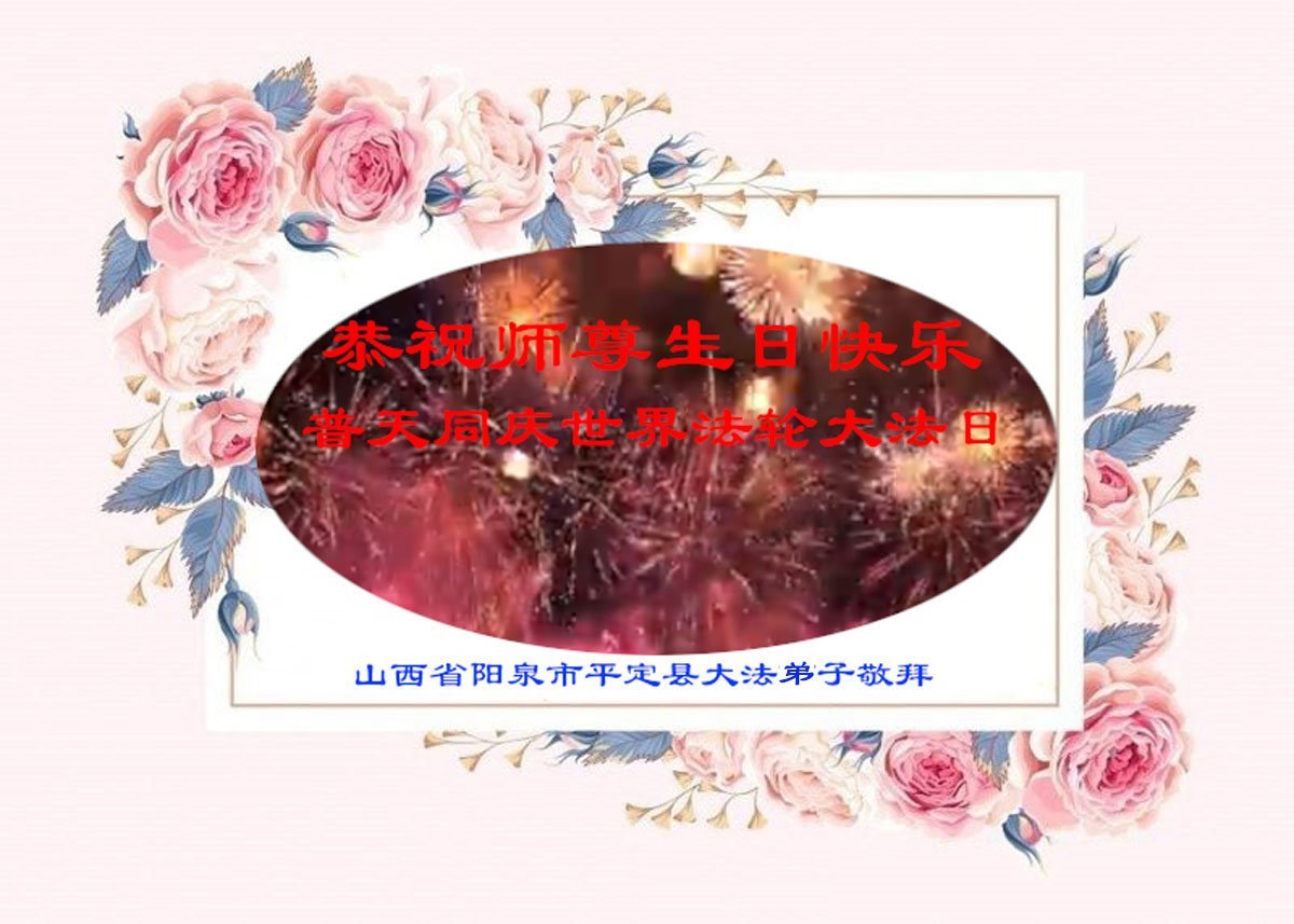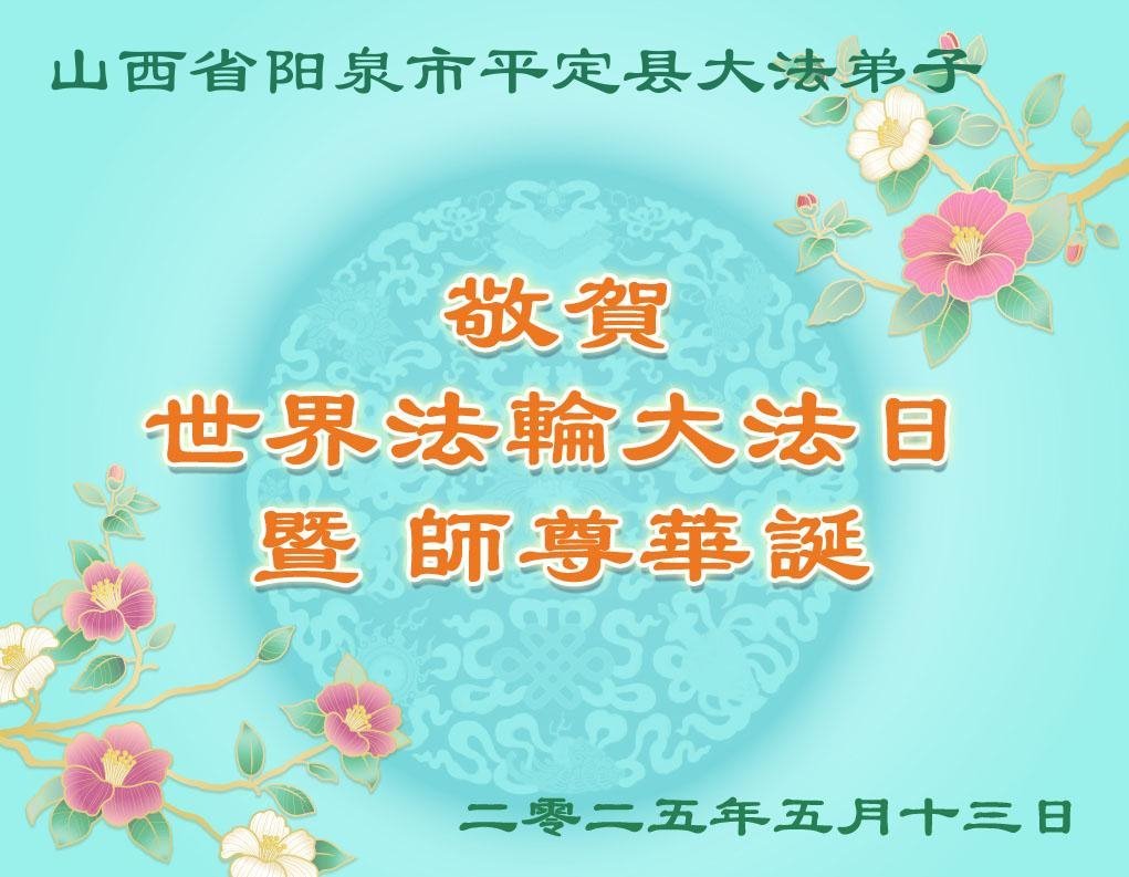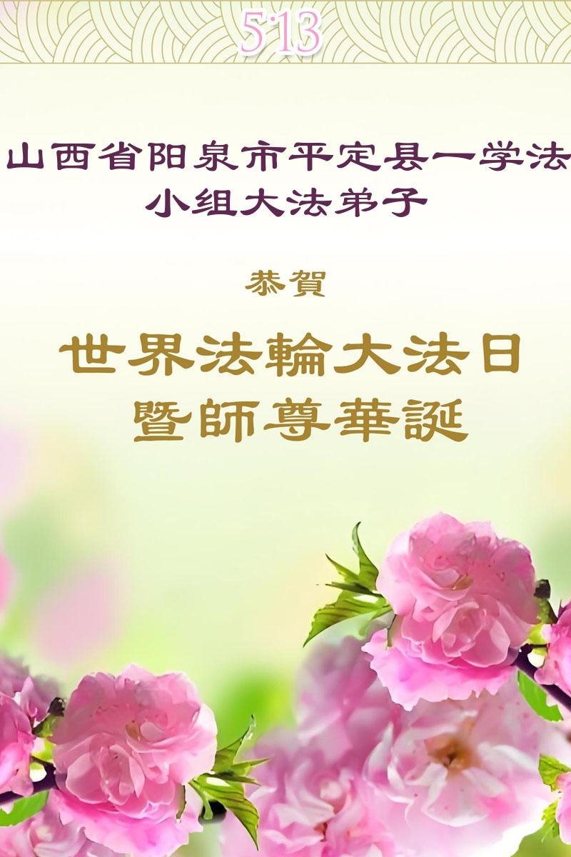山西省阳泉市平定县一学法小组大法弟子恭贺世界法轮大法日!恭祝师父生日快乐!
