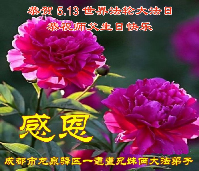 普天同庆5·13世界法轮大法日!恭祝师父华诞! 成都市龙泉驿区姨娘姨侄女俩大法弟子敬上 四川省成都市龙泉驿区部份大法弟子恭贺世界法轮大法日!恭祝师尊生日快乐!