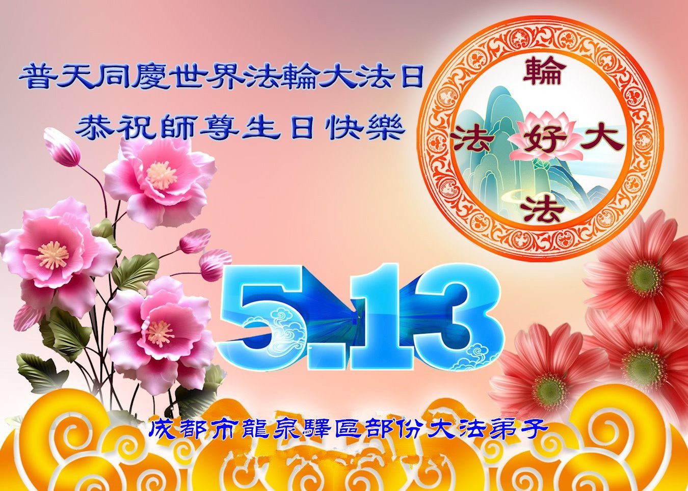 普天同庆世界法轮大法日!恭祝师尊生日快乐! 成都市龙泉驿区部份大法弟子敬上 四川省成都市彭州市一大法弟子恭祝师尊生日快乐!恭贺世界法轮大法日!