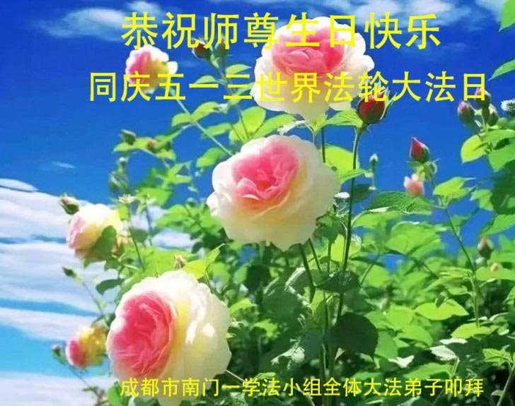 恭祝慈悲伟大的师尊生日快乐!普天同庆世界法轮大法日!世界需要真善忍!法轮大法好!真善忍好! 四川省温江区众大法弟子敬上 2025年5月6日 四川省成都市青羊区众大法弟子恭祝慈悲伟大的师尊生日快乐!恭贺世界法轮大法日!