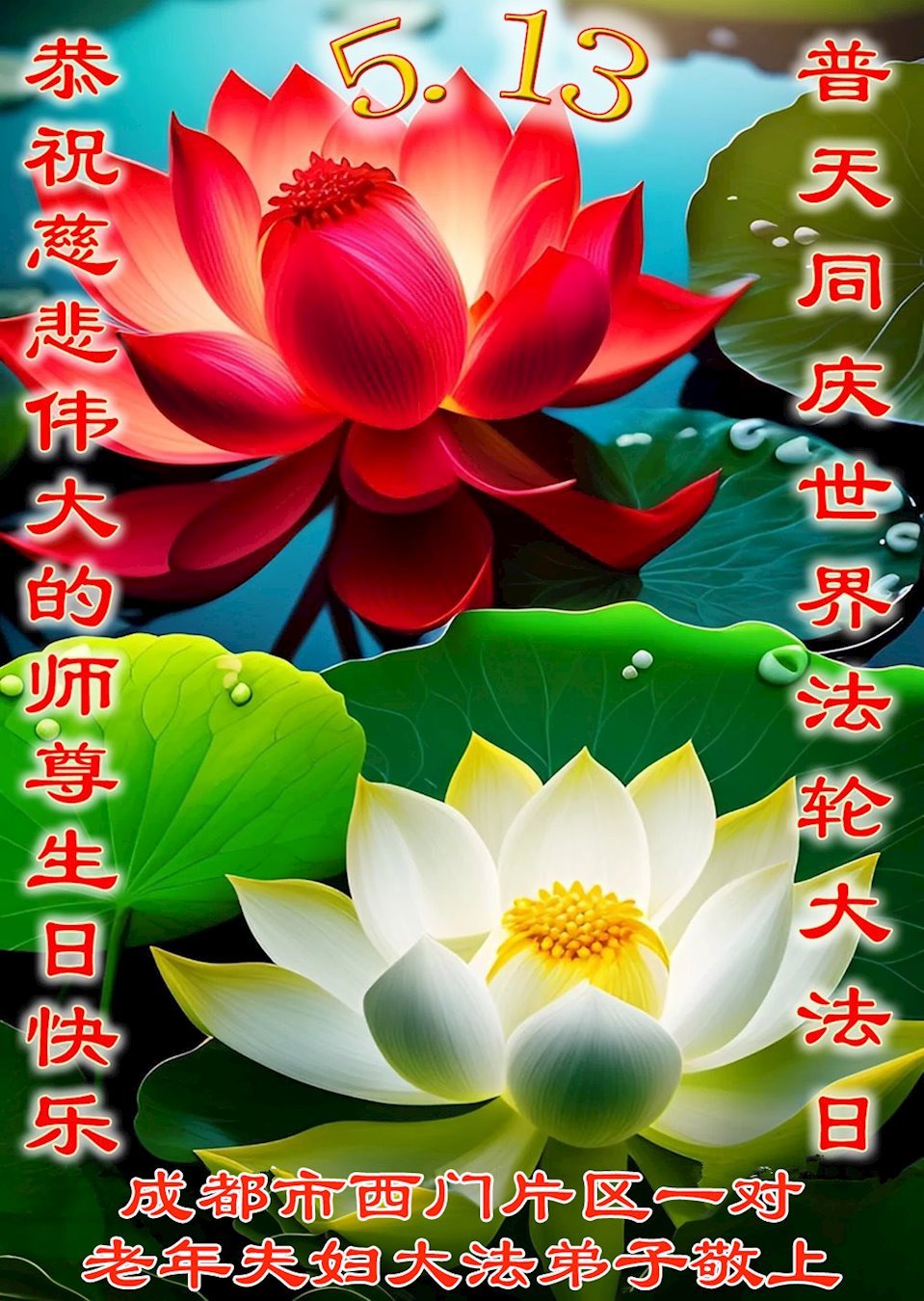 普天同庆513世界法轮大法日! 恭祝慈悲伟大的师尊生日快乐! 四川省成都市西门片区一对老年夫妇大法弟子敬上 四川省成都市西门片区一工程师大法弟子恭贺世界法轮大法日暨师尊生日快乐!
