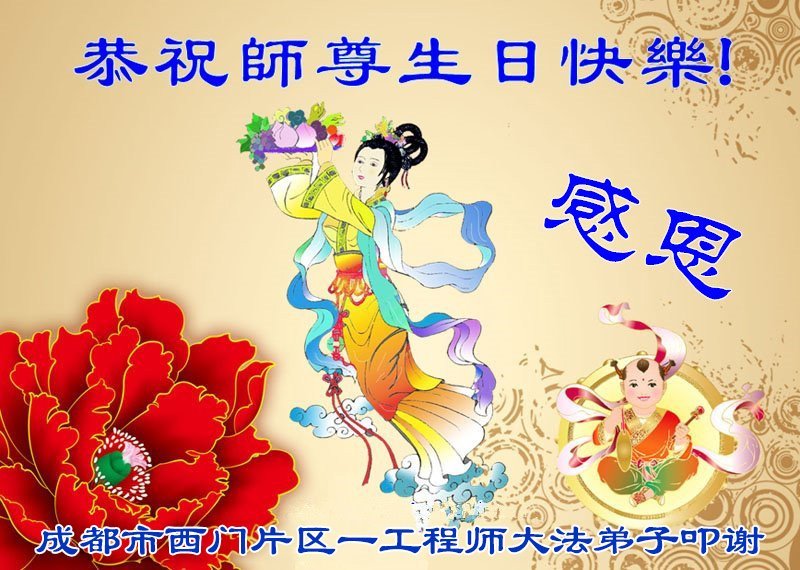 师父,您辛苦了! 大法弟子们感激您!大恩的师父啊,是您把我们从地狱中捞起洗净注入新的生命,使我们重新学会做人,并从此走上修炼之路,以宇宙中高德大法“真善忍”作为修炼人的最高标准,凡事以它作为衡量好坏人的唯一标准。请师父放心,作为被师父幸运救度的大法弟子,弟子一定在此末劫巨难中,放下各种执著心,认真做好三件事,多救世人,报谢师恩,圆满回归! 大陆四川邛崃大法弟子敬上 四川省成都市北郊一大法弟子恭贺世界法轮大法日!恭祝师尊生日快乐!