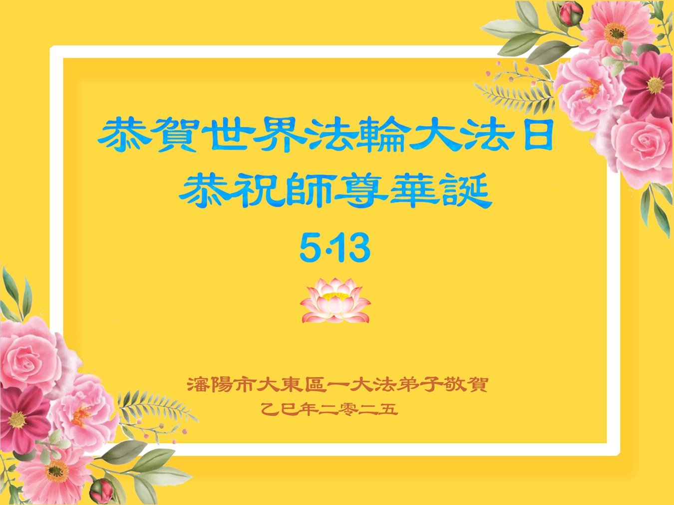 恭贺5.13世界法轮大法日!遥祝师尊生日快乐! 辽宁省沈阳市一大法弟子敬上 二零二五年四月三十日 辽宁省沈阳市一学法小组大法弟子恭祝师尊生日快乐!恭贺5.13世界法轮大法日!