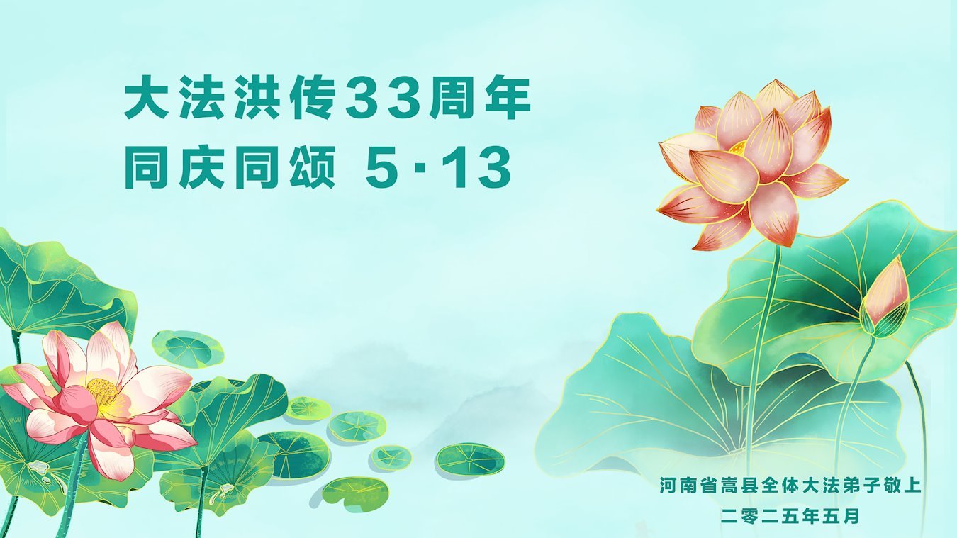 我们是河南周口一个五口修炼之家,时间过的好快,到2025年更感觉到师父给我们延续来的时间越来越短,我们要更加精進,跟上整体正法進程不掉队,圆满随师父回家!最后恭贺法轮大法洪传三十三周年!恭祝师父生日快乐! 河南周口一家五口大法弟子敬上 二零二五年四月三十日 河南省洛阳市嵩县全体大法弟子恭贺世界法轮大法日暨师尊华诞!