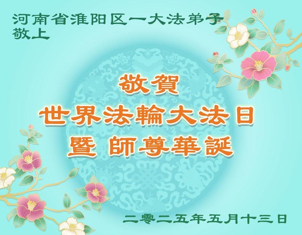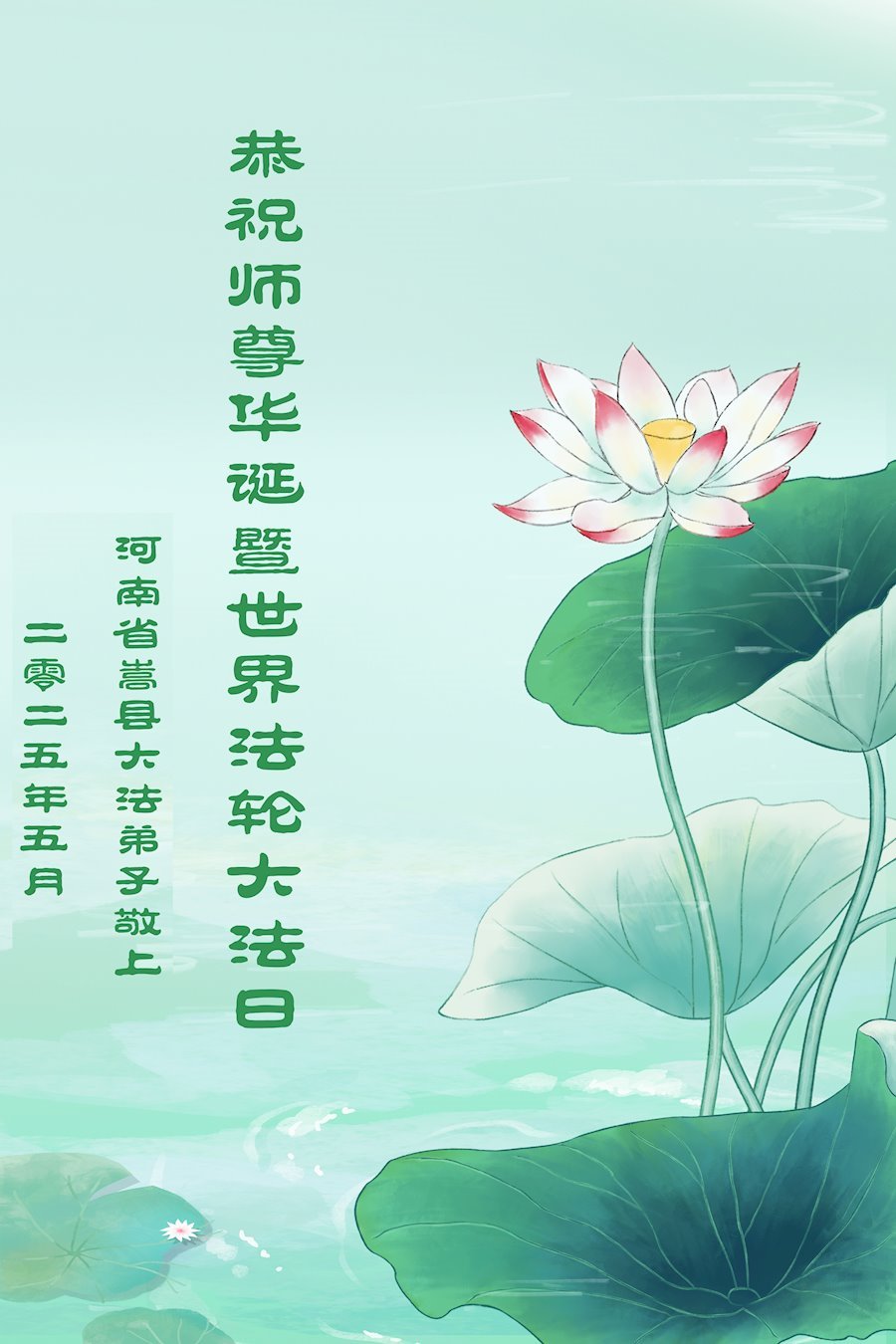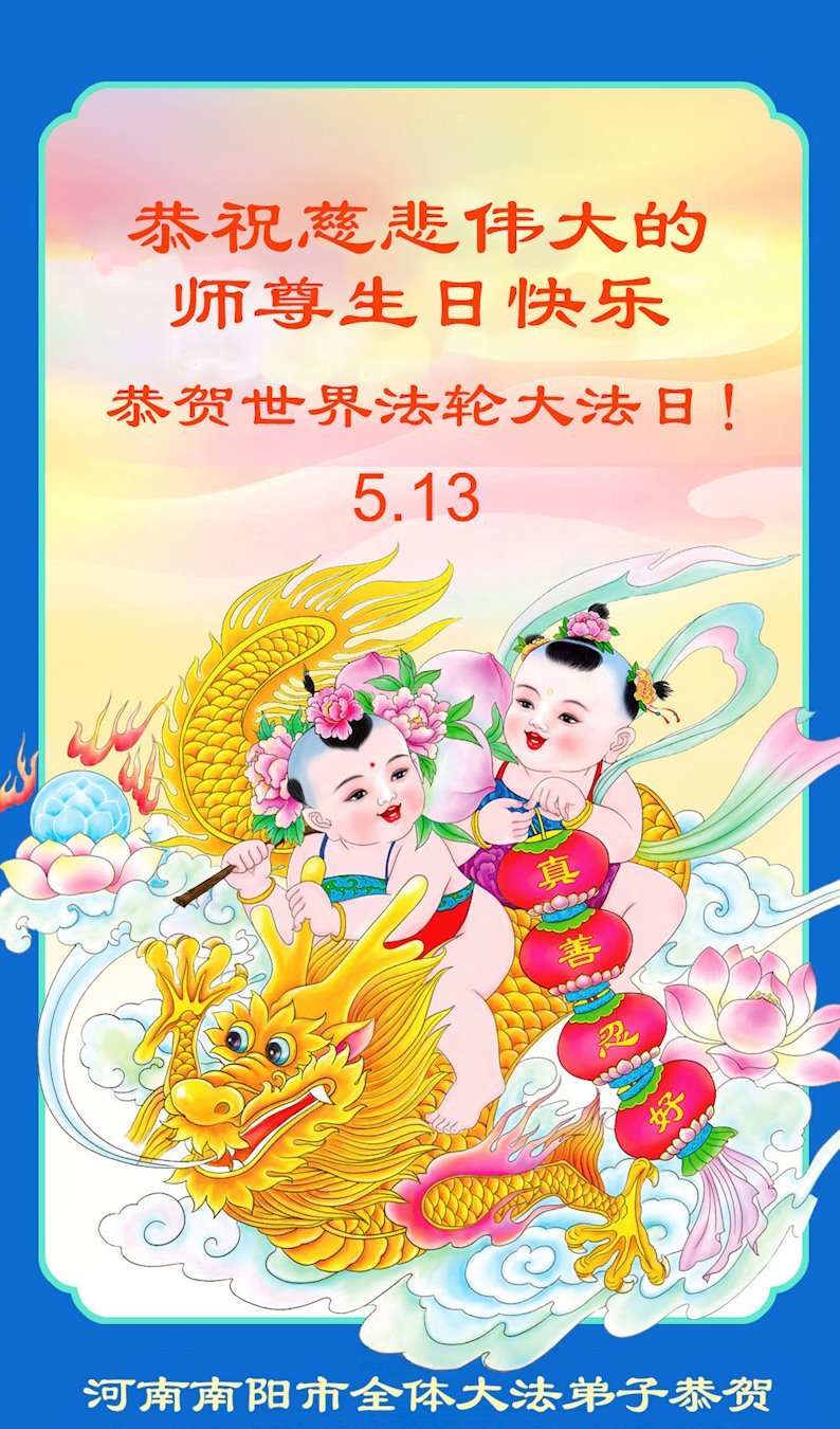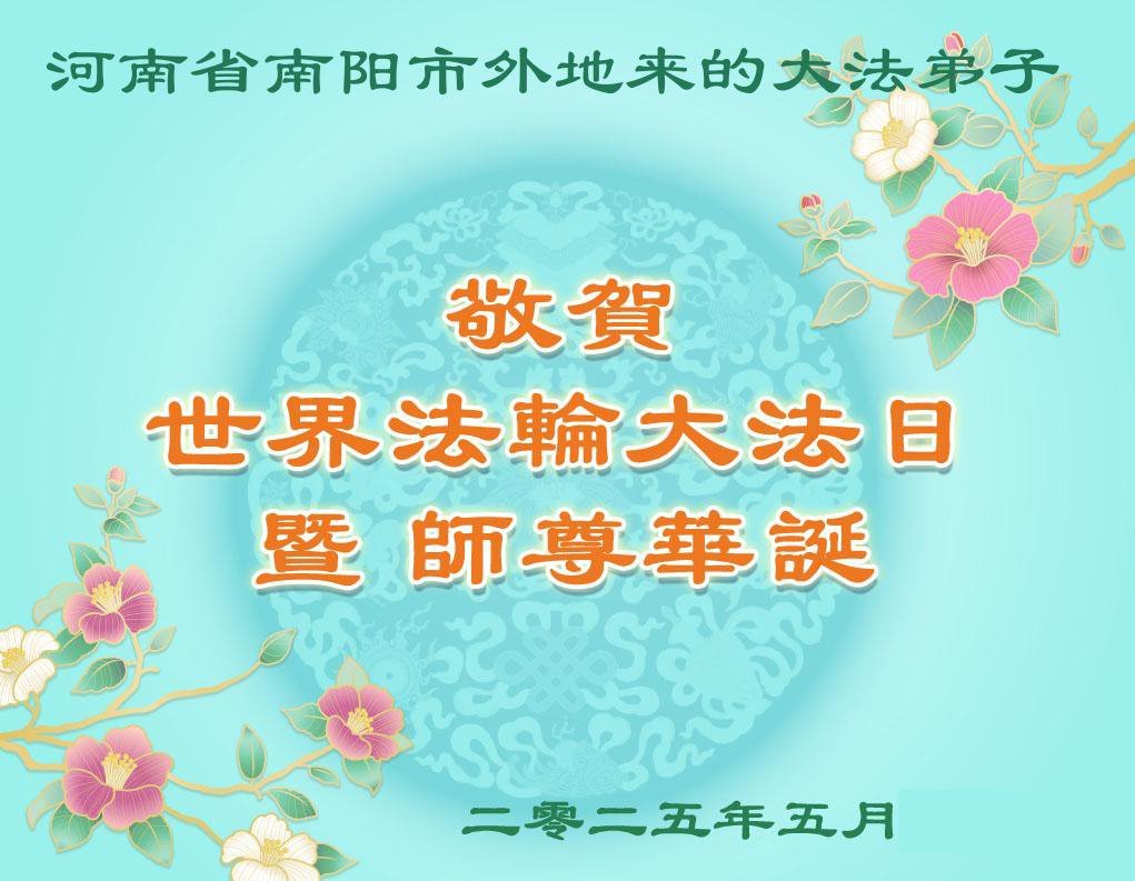 风雨数十载,离不开师尊的看护,感谢师尊慈悲救度、时时点悟,也感谢师尊对弟子全家的洪恩。弟子唯有努力精進,同化大法,做好三件事,愿师尊少一份操劳,多一份欣慰!师父,您辛苦了! 河南省洛阳市嵩县大法弟子敬上 二零二五年五月 河南省南阳市全体大法弟子恭贺世界法轮大法日暨师尊生日快乐!