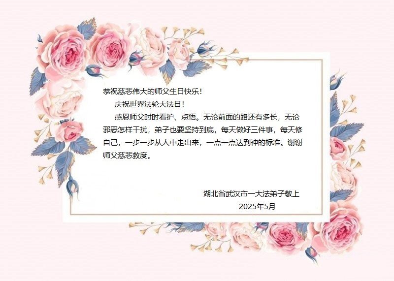 恭祝慈悲伟大的师尊生日快乐! 敬贺世界法轮大法日! 湖北大法弟子敬上 2025年5月 湖北省武汉市大法弟子恭贺世界法轮大法日!