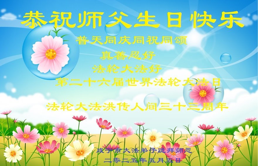 普天同庆同祝同颂: 恭祝师父生日快乐! 真善忍好,法轮大法好。 恭祝师父七十四岁华诞! 恭贺第二十六届世界法轮大法日! 庆贺法轮大法洪传世界三十三周年! 湖北省咸宁市大法弟子敬上 二零二五年五月五日 湖北省武汉市一家三口大法弟子恭贺世界法轮大法日暨师尊华诞!
