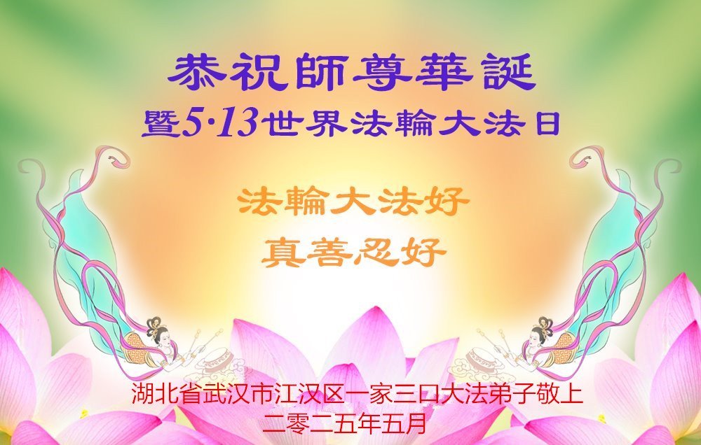 湖北省武汉市江汉区一大法弟子及全家恭贺法轮大法日!恭祝师尊生日快乐!