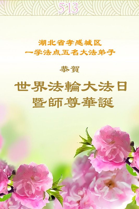 恭贺世界法轮大法日! 恭祝慈悲伟大的师尊生日快乐! 今生能够成为师父您的弟子,我们感到特别的幸福和荣耀,同时也感到责任重大。谢谢您赐予我们救度众生的使命和荣耀!弟子们唯有精進实修,把没做好的尽量做好,把恩师赐予的得救机缘带给众生,以报恩师对弟子的慈悲苦度,圆满随师还。 湖北省武汉市黄陂区大法弟子敬上 二零二五年五月一日 湖北省孝感城区一学法点五名大法弟子恭贺世界法轮大法日暨敬祝慈悲伟大的师尊生日快乐!