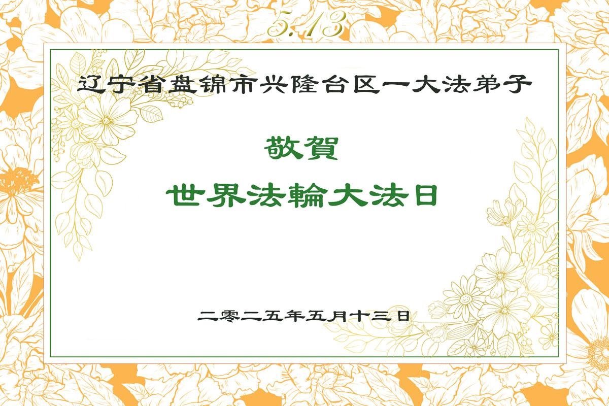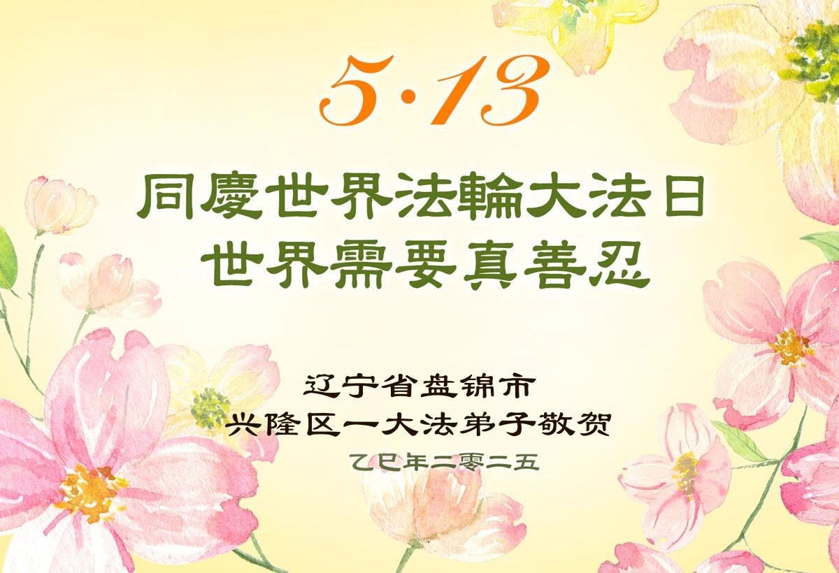 恭祝师尊生日快乐!普天同庆世界法轮大法日! 辽宁省盘锦市双台子区商业城大法弟子敬上 二零二五年五月四日 辽宁省盘锦市一大法弟子恭贺5.13世界法轮大法日!恭祝师尊生日快乐!