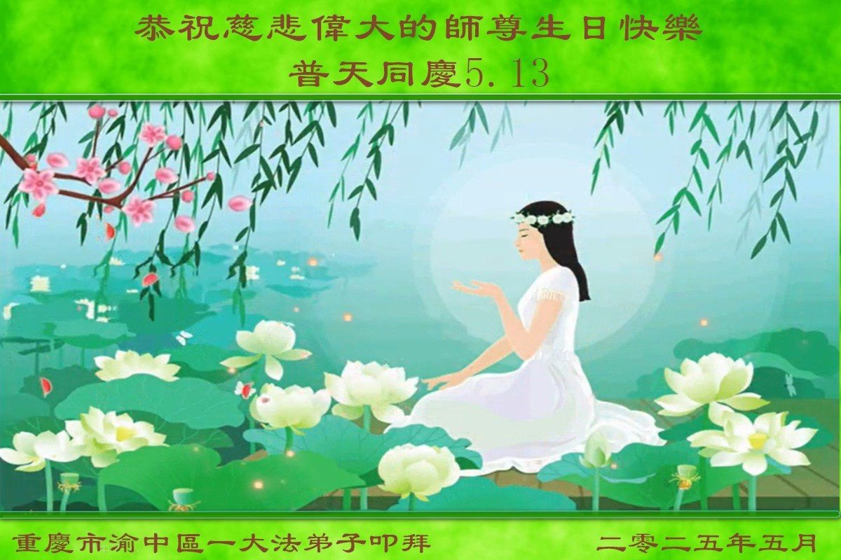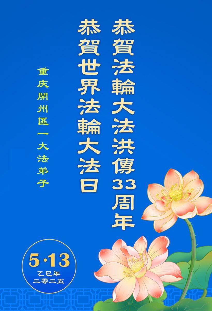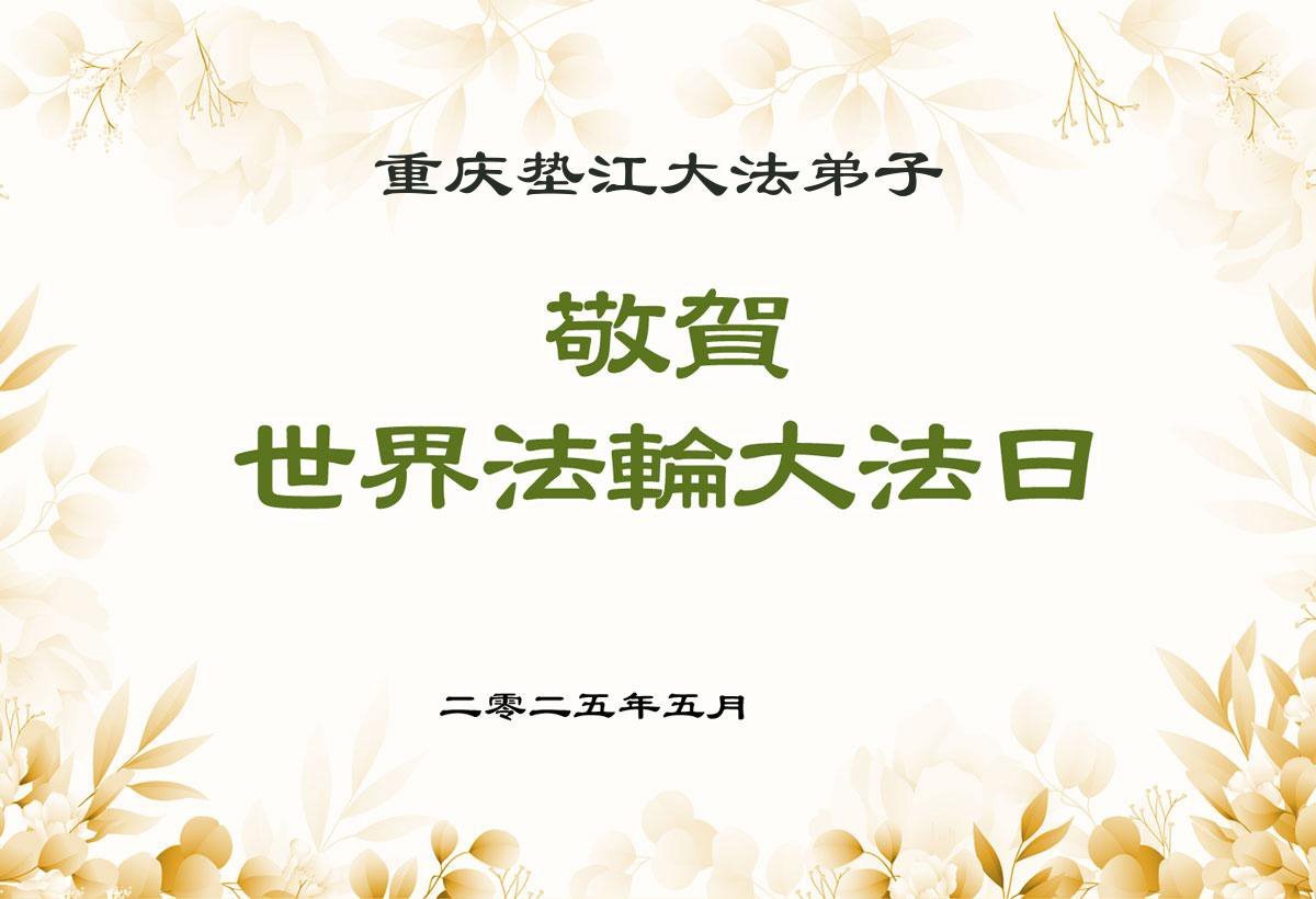 恭贺法轮大法洪传33周年! 恭贺世界法轮大法日! 恭祝师尊华诞! 重庆市大法弟子敬上 二零二五年五月一日 重庆市一学组大法弟子恭贺法轮大法日暨师尊华诞!