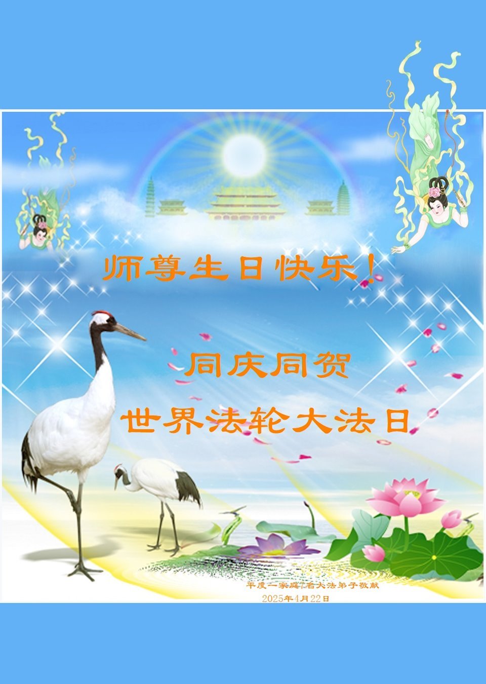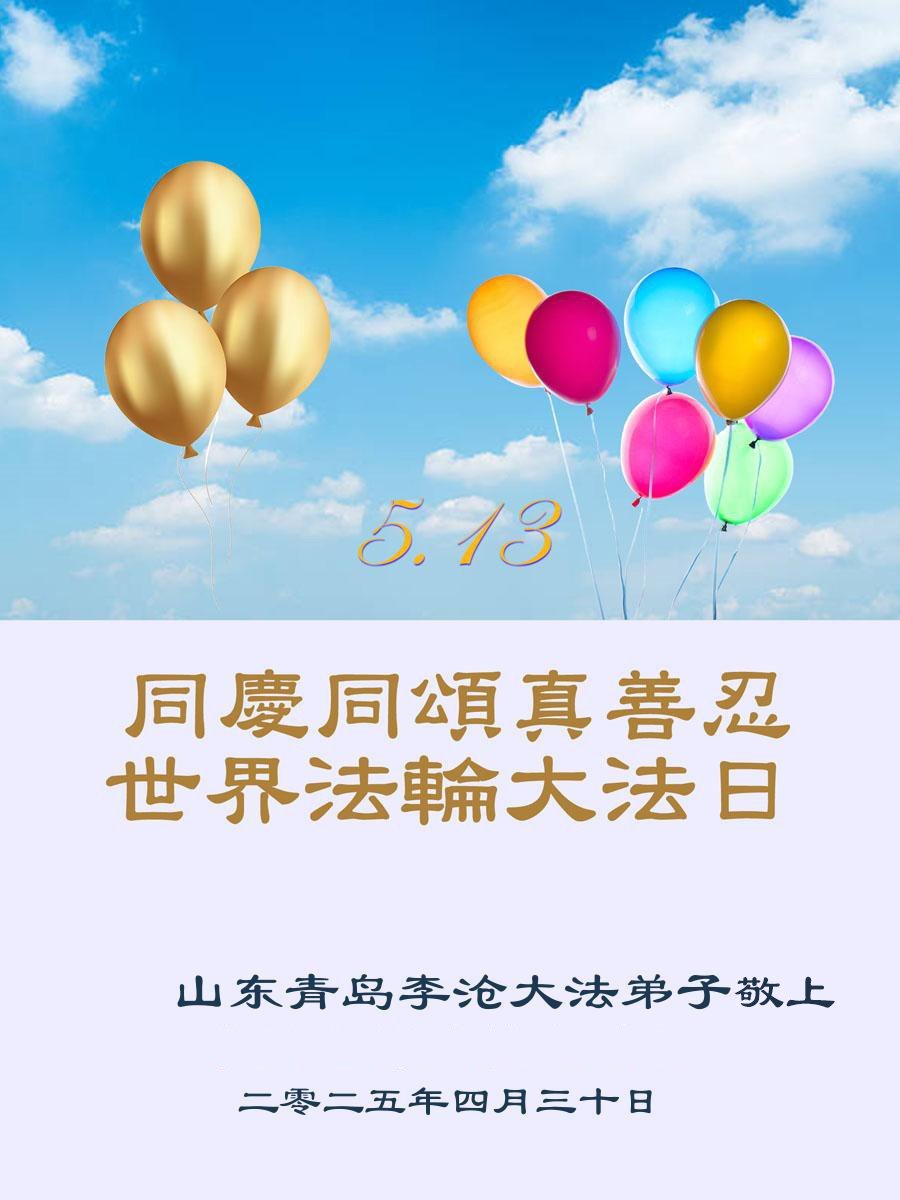 【明慧网二零二五年五月十一日】 山东省青岛市一大法弟子恭贺世界法轮大法日!恭祝慈悲伟大的师父生日快乐!
