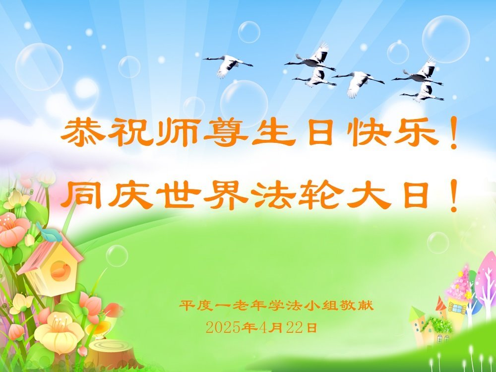 恭祝师尊生日快乐!感谢师尊慈悲救度。 山东省青岛市一学法小组全体大法弟子敬上 2025年4月29 日 山东省青岛平度大法弟子恭祝慈悲伟大的师尊生日快乐!恭贺世界法轮大法日!