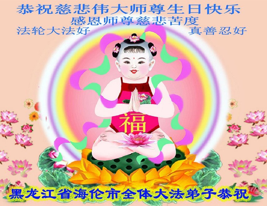 恭祝慈悲伟大的师尊生日快乐!恭贺世界法轮大法日! 黑龙江省牡丹江市林口县一老年大法弟子敬上 黑龙江省绥化市海伦市海伦镇大法弟子恭贺世界法轮大法日暨敬祝慈悲伟大的师尊生日快乐!