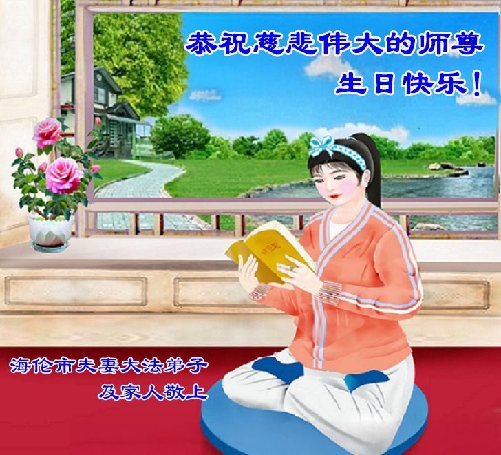 值此世界法轮大法日到来之际,向伟大的师尊致以最崇高的敬意!感恩师父的慈悲苦度,使我们从迷茫中醒悟,我们一定要珍惜这万古不遇的修炼机缘,勇猛精進,做好三件事,共同提升,以报师恩,让师父多一些欣慰,少一些操劳,惟愿师尊笑。 黑龙江省绥化市海伦市夫妻大法弟子及家人恭贺世界法轮大法日暨敬祝慈悲伟大的师尊生日快乐!
