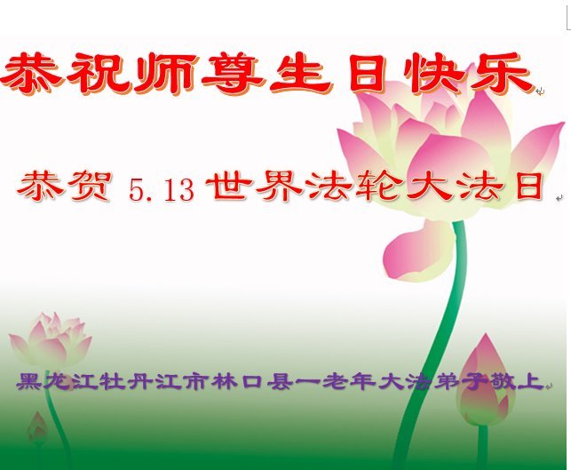 在这普天同庆的日子里,弟子感恩慈悲伟大的师父慈悲救度!弟子唯有精進实修多救人以报师恩。叩谢恩师慈悲救度! 黑龙江省牡丹江市林口县一老年大法弟子恭贺世界法轮大法日暨敬祝慈悲伟大的师尊生日快乐!