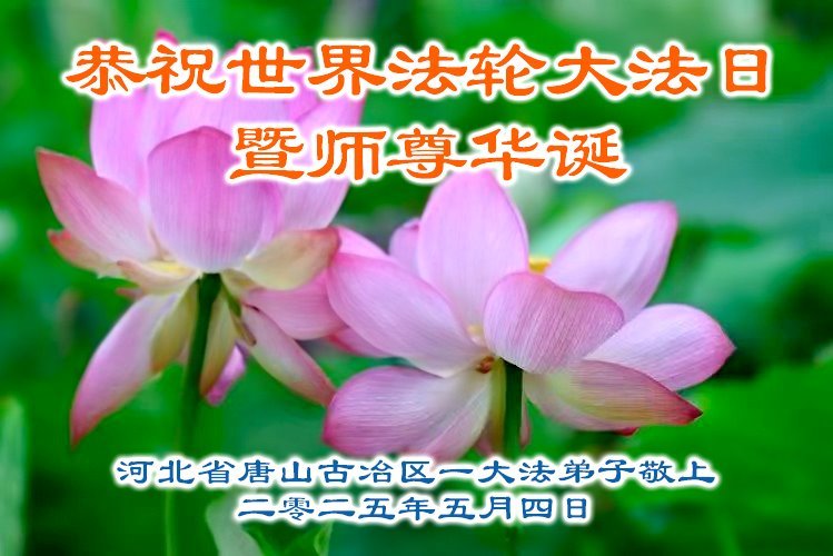 法轮大法好!真善忍好!谢谢慈悲伟大的恩师! 河北唐山古冶区一学法小组大法弟子敬上 二零二五年五月四日 河北唐山古冶区一大法弟子恭贺世界法轮大法日!