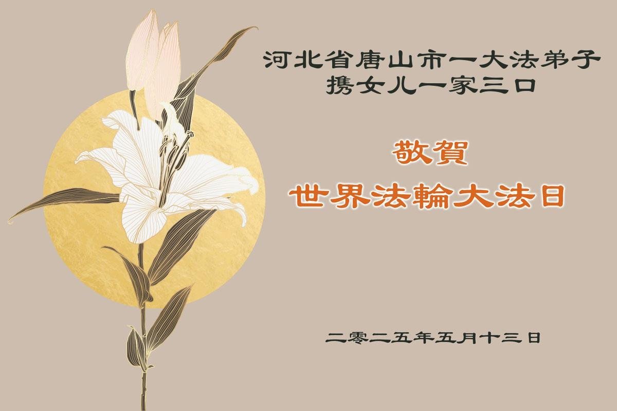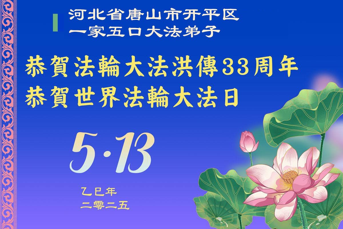 恭贺法轮大法洪传33周年!恭贺世界法轮大法日! 河北省唐山市一家5口大法弟子敬上 二零二五年五月五日 河北省唐山一大法弟子敬贺世界法轮大法日暨师尊华誔!