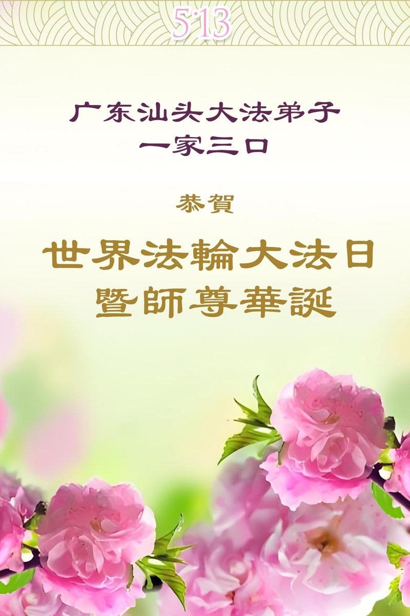 广东省佛山大法弟子叩谢师恩!普天同庆世界法轮大法日!庆祝法轮大法洪传三十三周年! 广东汕头大法弟子一家三口恭贺世界法轮大法日暨师尊华诞!