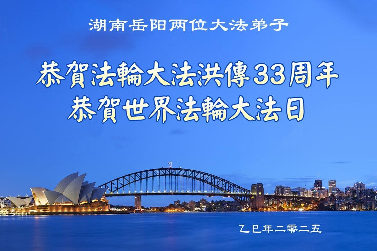 湖南岳阳两位大法弟子恭祝师尊生日快乐!恭贺世界法轮大法日!