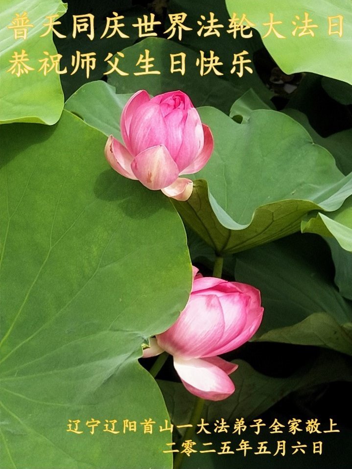 恭贺世界法轮大法日暨师尊生日快乐! 师父您辛苦了! 谢谢师父慈悲救度! 辽宁省辽阳首山大法弟子敬上 辽宁省辽阳首山一大法弟子全家恭贺世界法轮大法日暨师尊生日快乐!
