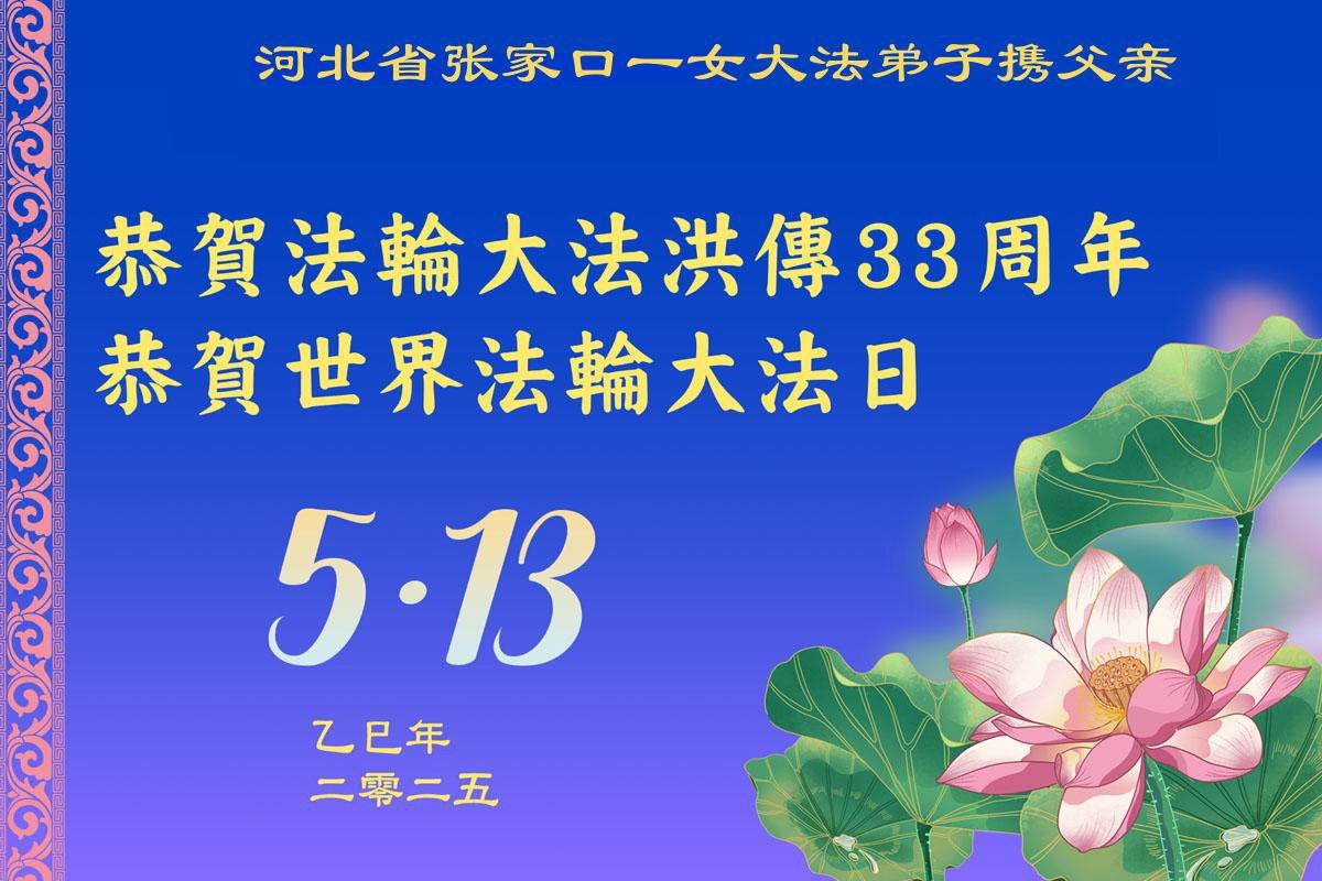 我是一位明白真相并且为遭受迫害的大法弟子做无罪辩护的律师,恭祝李大师华诞暨世界法轮大法日!在这寰宇更新的历史时刻!是您把真、善、忍的高德大法带到人间!是您力挽狂澜救度众生于坏灭的瞬间!是您教出这么多敢于走真理之路的大法弟子!是您为未来开拓了希望!是您为宇宙拨乱了反正!是您的真理之光照亮世界驱散了阴霾! 您已经桃李满天下!您的弟子们在自身遭受磨难中还在慈悲救度众生的壮举感动了我!感动了世界!更感动了苍宇!他们正在镌刻着一座座历史的丰碑!可歌可泣感天动地!正义越来越彰显出来!我在用心的期待!期待着法正人间那一刻的到来!再次恭祝李大师生日快乐!合十! 中国大陆一位明真相的无罪辩护律师敬上 二零二五年四月三十日 河北省张家口市一女大法弟子携父亲恭贺世界法轮大法日暨师父生日快乐!