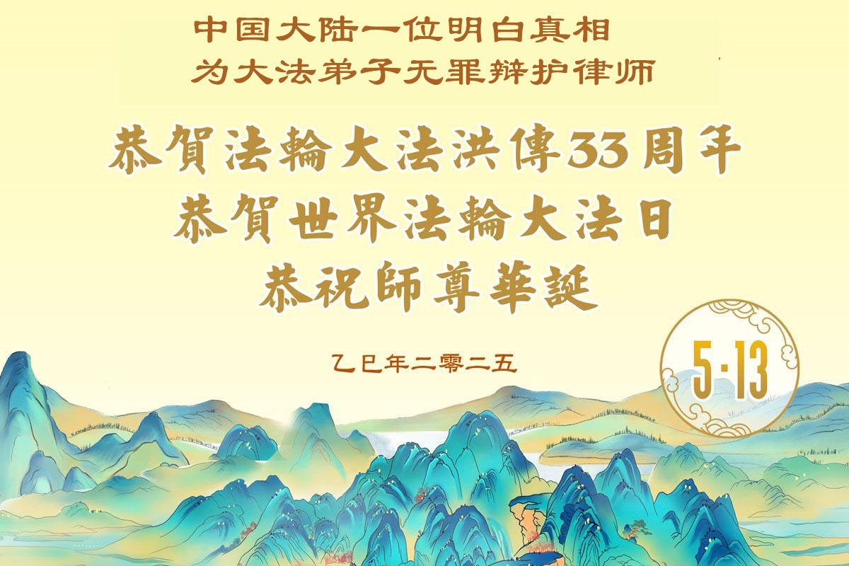 | 【明慧网二零二五年五月十一日】法轮大法洪传于世三十三年,大法弟子的亲朋好友、邻居同事们亲眼见证了法轮功祛病健身的奇效,见证了大法教人修心向善,修炼者看淡名利不争不斗。相信法轮大法好的世人,即使尚未修炼,也得到了大法赐予的不可思议的福报。中国大陆明白真相的人们衷心的祝贺尊敬的李洪志大师华诞快乐!庆贺世界法轮大法日! 山东烟台市一位朋友赞叹:“尊敬的大法师父,我的朋友中有好几个是您的弟子,我和他们在一起时,就能感受到大法修炼者的宽容忍让,坚守正义的高贵品质。他们告诉我诚念‘法轮大法好!真善忍好!’真是这样,我每每诚心诵念都会感到心中发热,身体轻松,心情愉悦。大法师父太伟大了!” 广东惠东县一个大法弟子的家属感恩道:“我的家庭从支离破碎修复到人人羡慕,我的事业从负债累累到现在小有盈余,是师父、是大法让我们明白了做人的真正目地,明白什么叫真、善、忍。法轮大法真好!” 一位为大法弟子做无罪辩护的律师恭贺李大师:“您已经桃李满天下!您的弟子们在自身遭受磨难中还在慈悲救度众生的壮举感动了我!感动了世界!更感动了苍宇!他们正在镌刻着一座座历史的丰碑!正义越来越彰显出来!我在用心的期待!期待着法正人间那一刻的到来!” 重庆市潼南区明白真相的世人恭贺世界法轮大法日暨师父生日快乐!