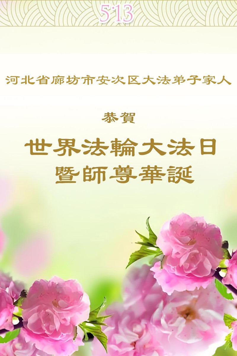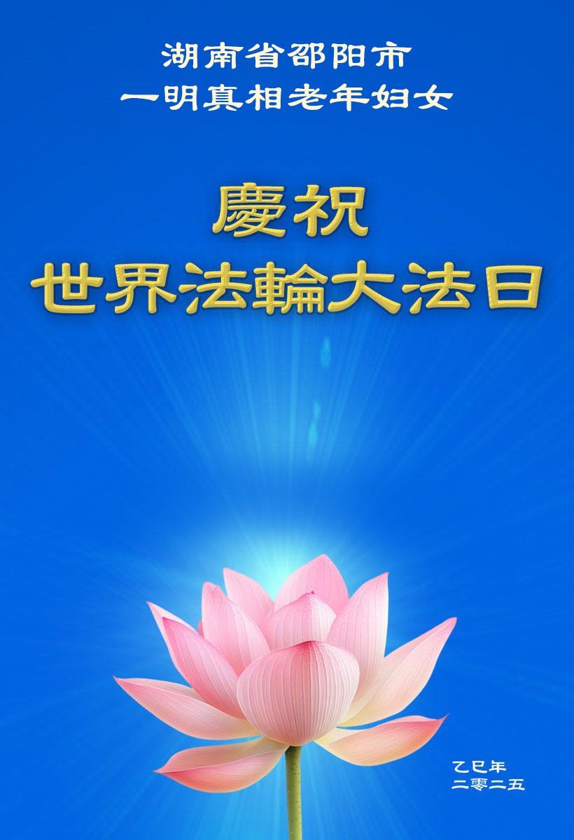 北京市一居民说:“从今天(2025年5月5日)开始,我天天心里想着给师父问好,到师父生日那一天,我就代表我们全家,双手合十,祝李洪志师父生日快乐!” 北京市一妇女在这几年里,她的身体健康、家庭和睦,她知道这都是相信大法、支持大法,给她带来的福份。今年的“五·一三”即将来临,她诚恳的说:“恭祝李大师生日快乐!” 北京郊区一村民说:“李大师救了我,祝李洪志大师生日快乐!幸福!” 湖南省邵阳市一明真相老年妇女恭贺世界法轮大法日!