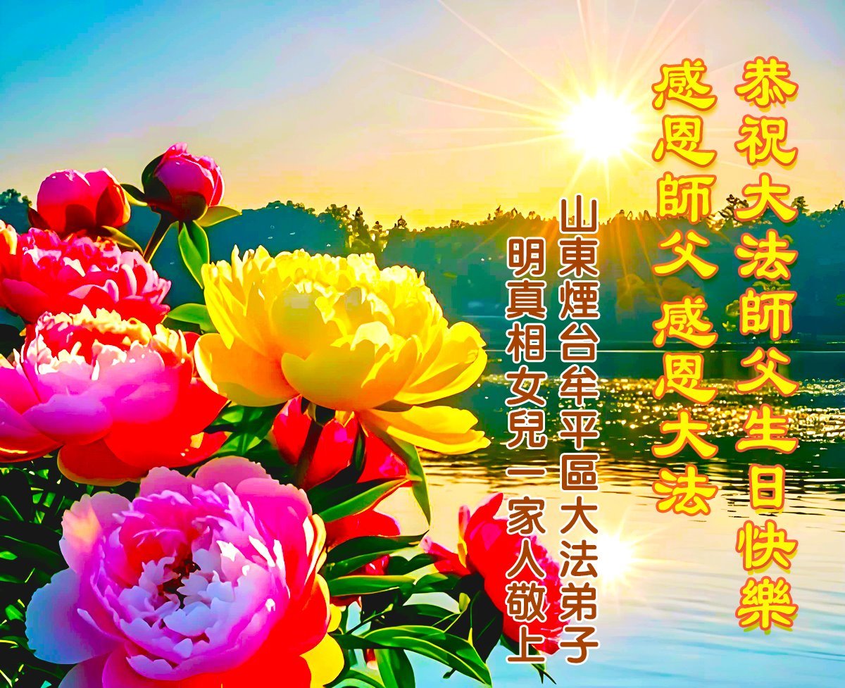 恭祝李老师生日快乐!恭贺法轮大法洪传世界33周年!尊敬的李老师:您好!今年5.13在您生日来临之际,我和我的家人祝您生日快乐!感谢您的慈悲救度!让我和家人受益多多,您传的大法,虽然我未修炼,但大法的洪大,通过我父母们的修炼,我们也有所感悟,感谢李老师给我们全家带来的福缘!再次祝李老师生日快乐!盼李老师早日回国! 四川南充大法弟子家人敬上 二零二五年四月二十七日 山东省烟台市牟平区明真相世人恭贺世界法轮大法日暨敬祝师尊生日快乐!