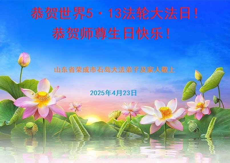 山东荣成大法弟子及家人恭贺世界法轮大法日!恭祝师尊生日快乐!