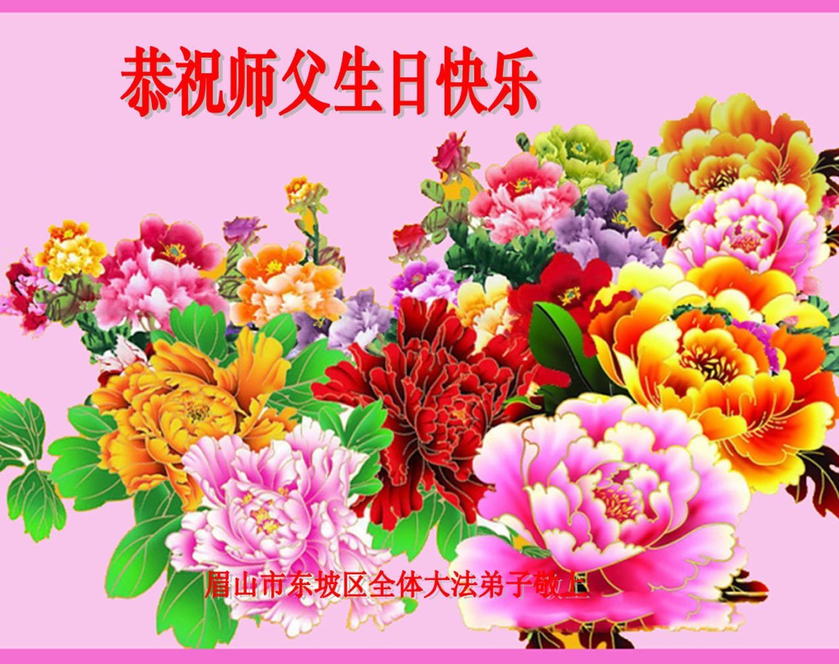 眉山东坡区大法弟子恭迎世界法轮大法日!恭祝师尊生日快乐!