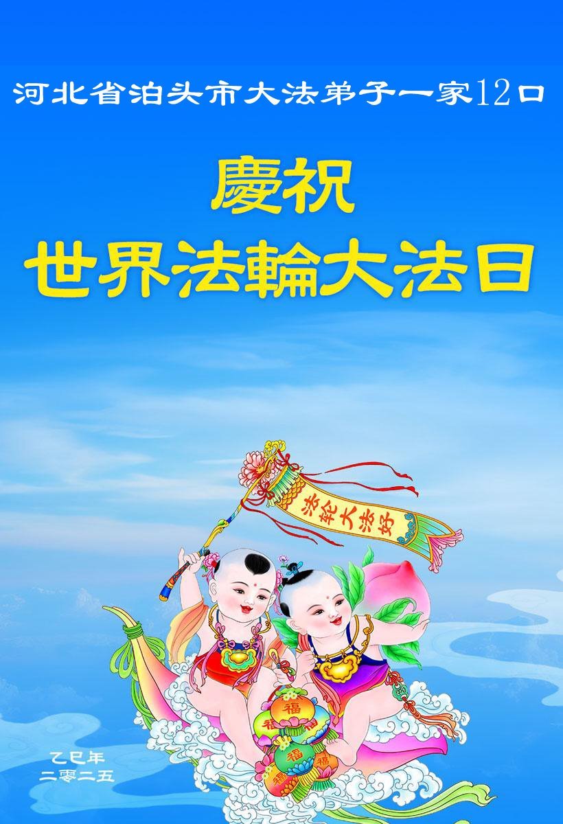 河北省沧州市泊头市大法弟子一家9口庆贺世界法轮大法日!恭祝师尊生日快乐!
