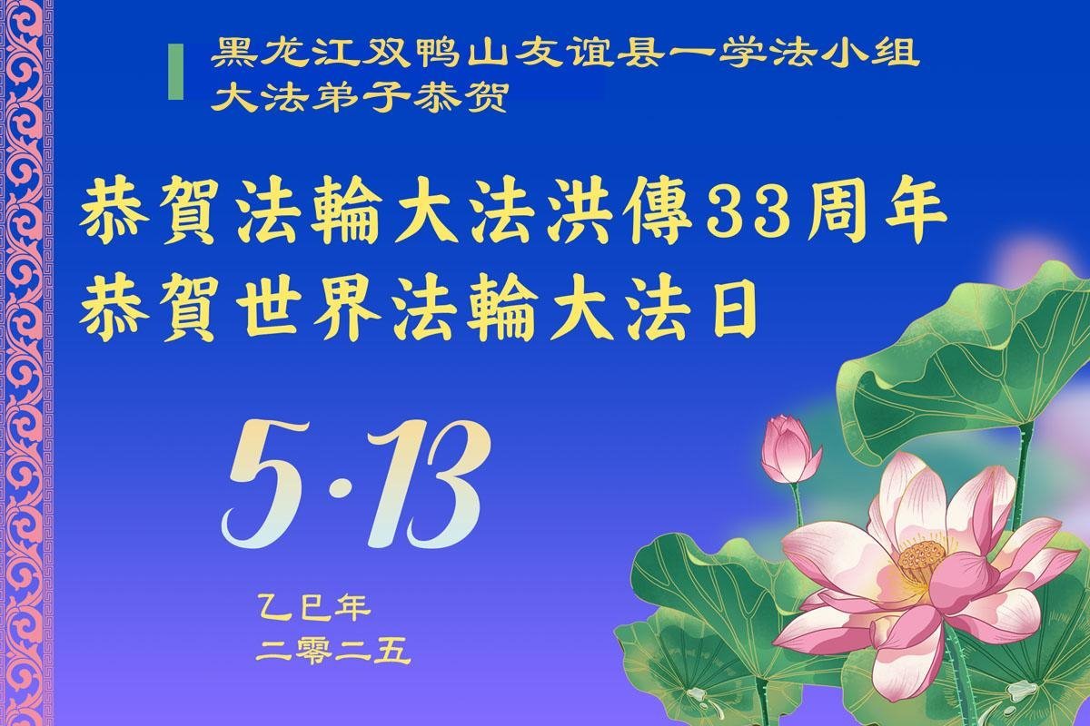 普天同庆世界法轮大法日!庆祝法轮大法洪传三十三周年!叩谢师恩! 黑龙江省双鸭山市友谊县一学法小组大法弟子恭贺世界法轮大法日!恭祝师尊华诞!
