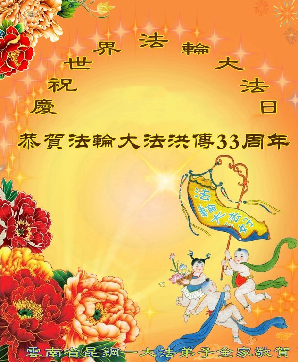 恭贺法轮大法洪传33周年!庆祝世界法轮大法日! 云南省昆钢一大法弟子全家敬上 |