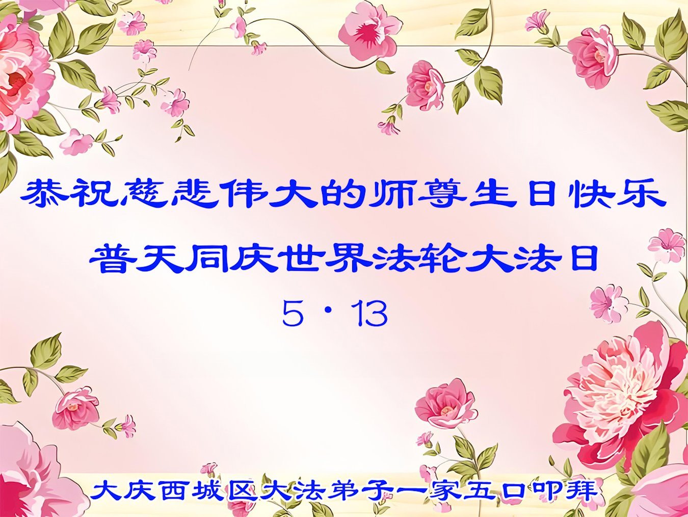 敬祝师父生日快乐!恭贺5·13世界法轮大法日! 黑龙江省大庆西城区大法弟子一家五口敬上 黑龙江省大庆市大法弟子恭贺世界法轮大法日!