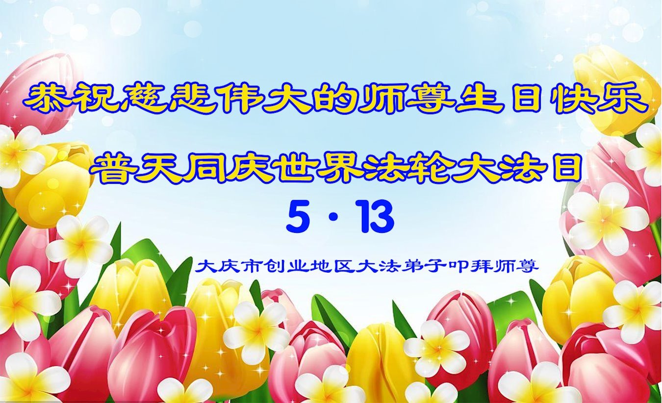 敬祝师父生日快乐!恭贺5.13世界法轮大法日! 黑龙江省大庆市创业地区大法弟子敬上 黑龙江大庆市大法弟子恭贺世界法轮大法日!恭祝师父生日快乐!