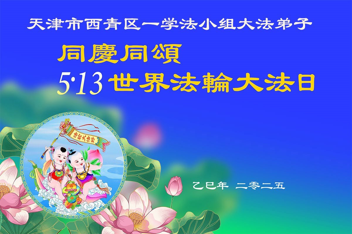 天津市西青区一学法小组大法弟子恭贺法轮大法洪传33周年!