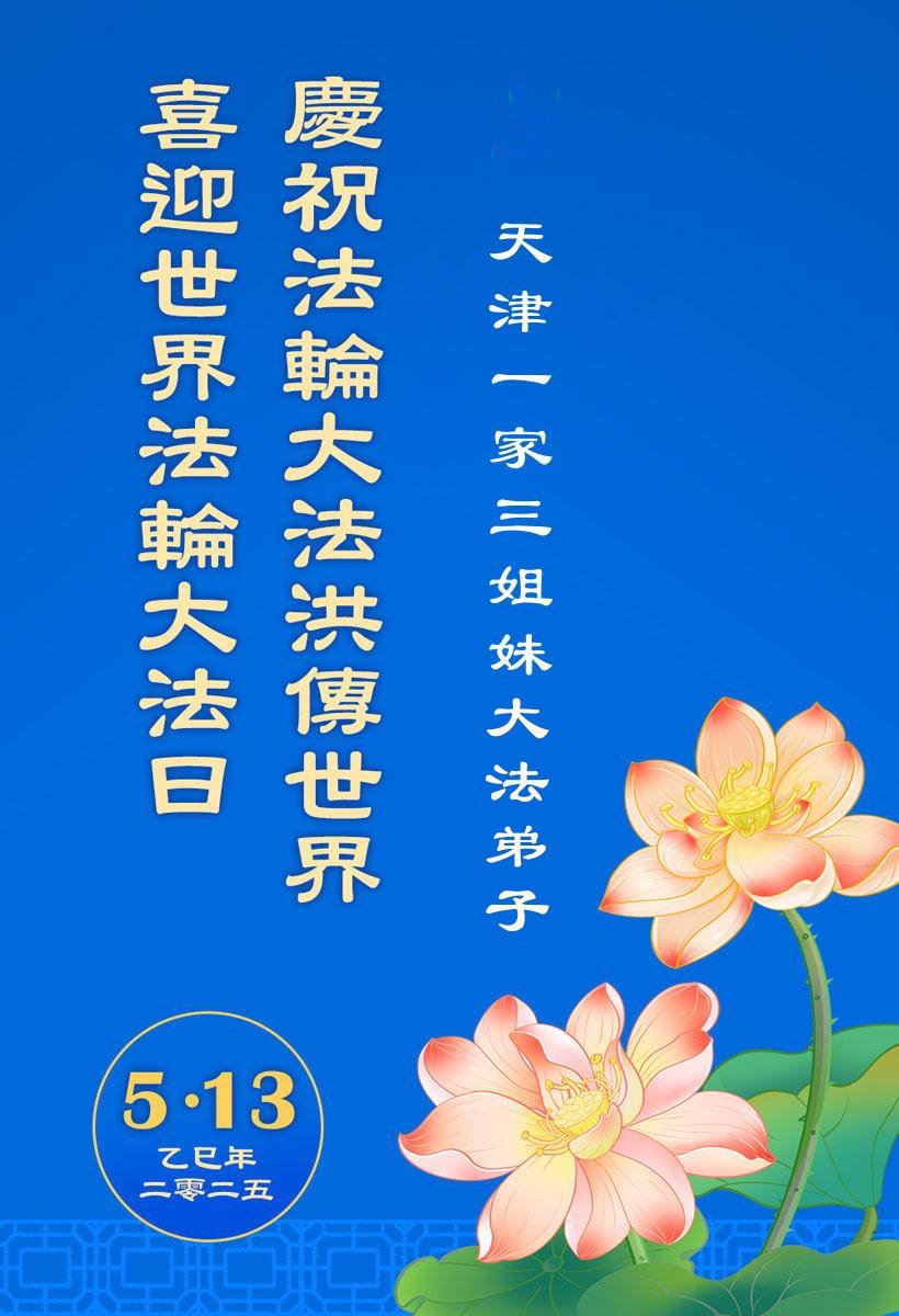 河北市天津一家三姐妹大法弟子恭贺法轮大法洪传世界三十三周年!