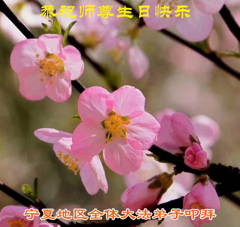 普天同庆五一三, 恭祝师尊今华诞, 感恩师尊大法传, 拯救苍宇度劫难。 普天同庆五一三, 师尊辛劳大法传, 看护弟子再修炼, 捞起洗净接上天。 普天同庆五一三, 沐浴众生脱苦难, 大法教人明真相, 三:退.才能保平安。 宁夏回族自治区大法弟子家人恭贺世界法轮大法日暨敬祝师尊生日快乐!