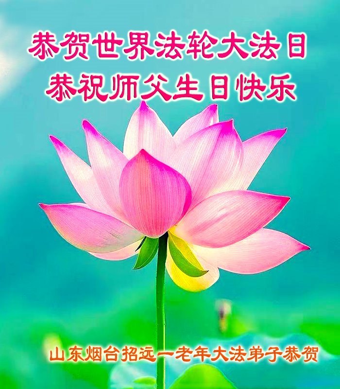 普天同庆、同颂5.13世界法轮大法日! 恭祝慈悲伟大的师尊生日快乐! 山东大法弟子敬上 山东烟台招远一老年大法弟子恭贺世界法轮大法日!恭祝师父生日快乐!