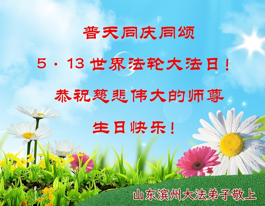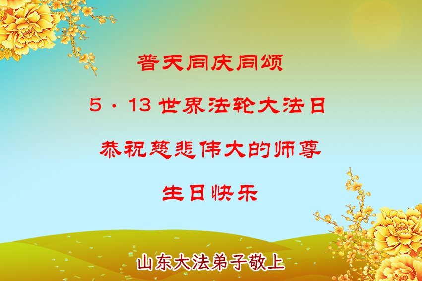 普天同庆、同颂世界法轮大法日! 恭祝慈悲伟大的师尊生日快乐! 山东滨州大法弟子敬上 山东大法弟子恭贺世界法轮大法日!恭祝师尊生日快乐!