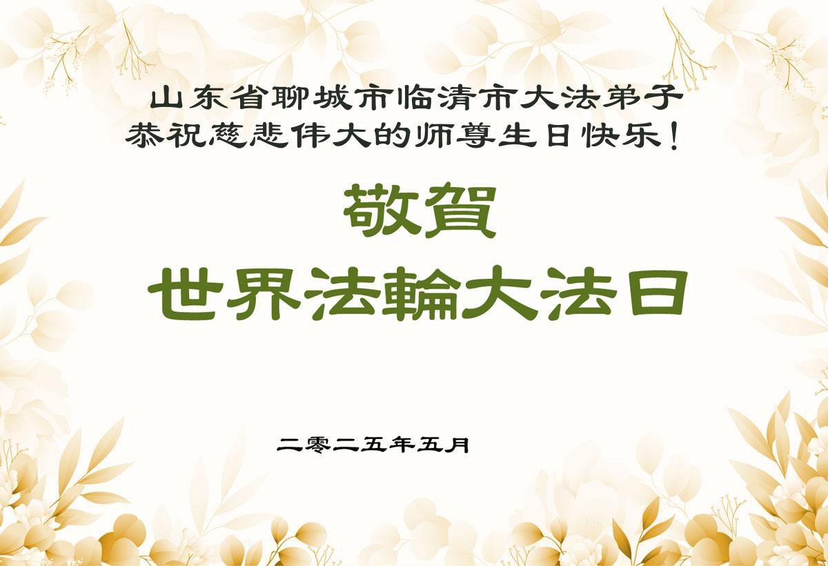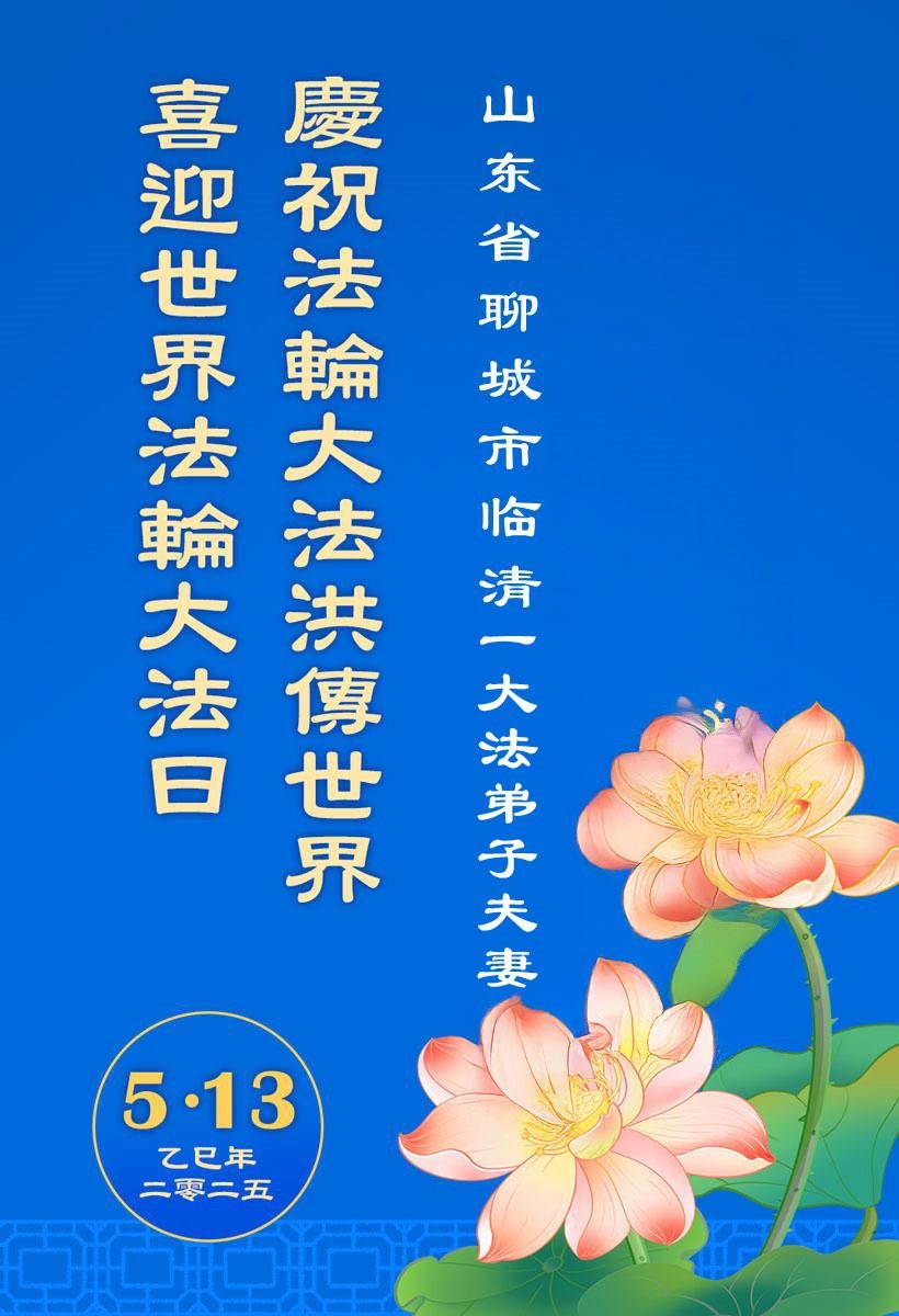 山东省聊城市临清市大法弟子夫妻二人恭贺世界法轮大法日暨慈悲伟大的师尊生日快乐!