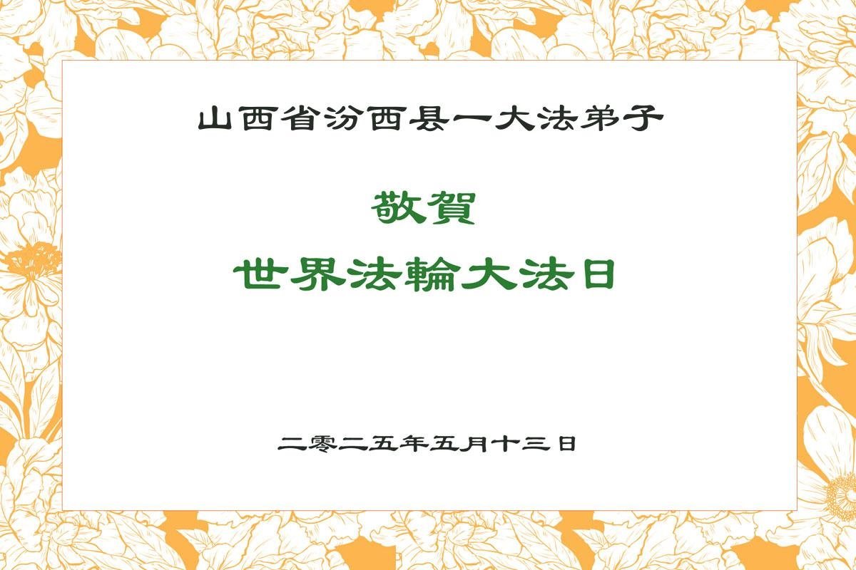 【明慧网二零二五年五月十二日】 山西省临汾一夫妻大法弟子恭贺世界法轮大法日暨师尊华诞!