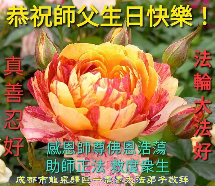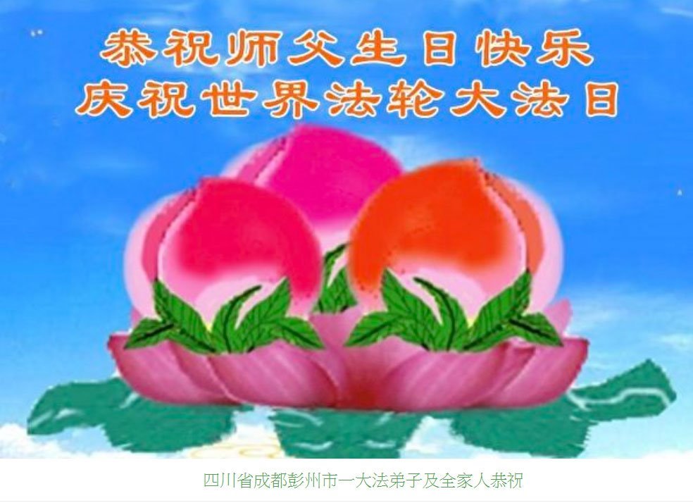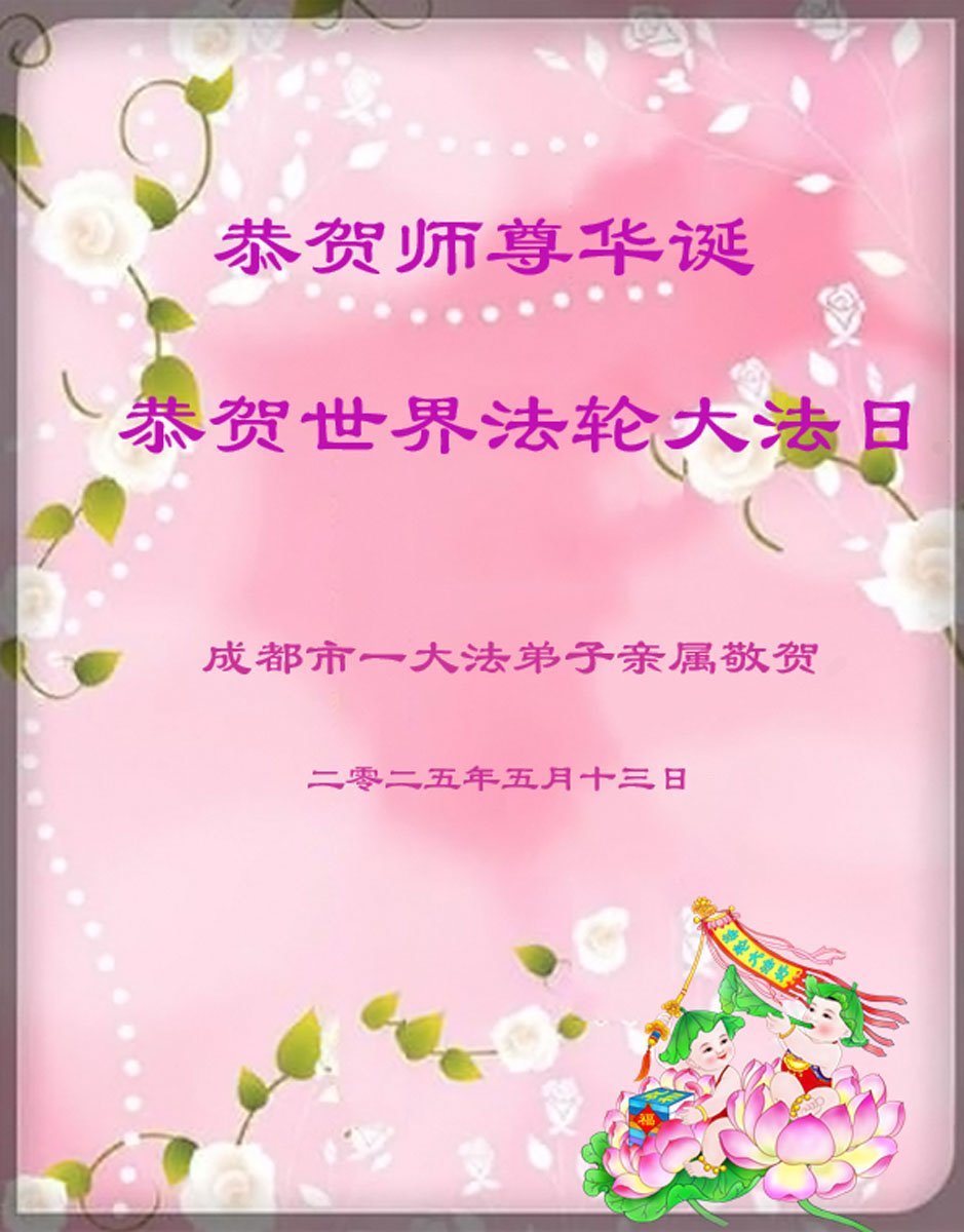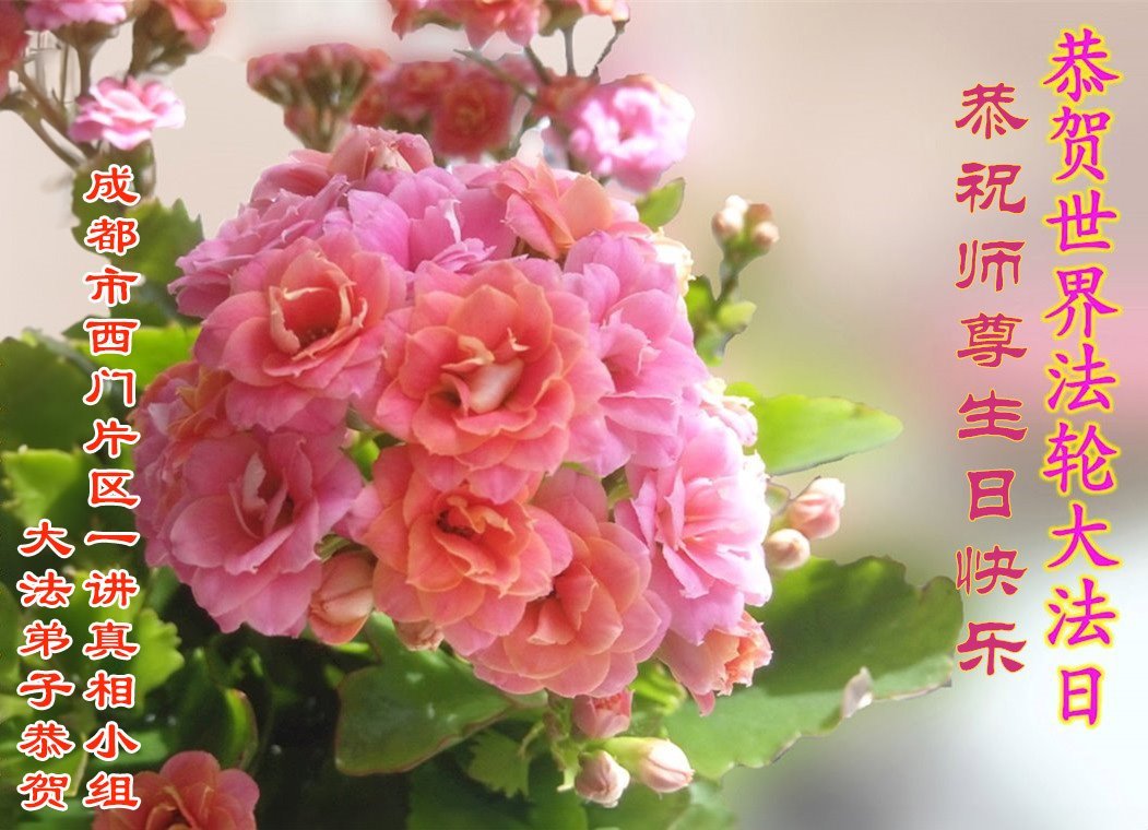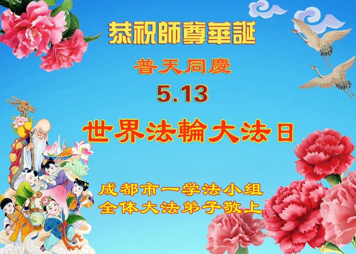 恭贺世界法轮大法日! 恭祝师尊生日快乐! 四川省成都市西门片区一讲真相小组大法弟子敬上 四川省成都一大法弟子亲属恭祝大法师父生日快乐!