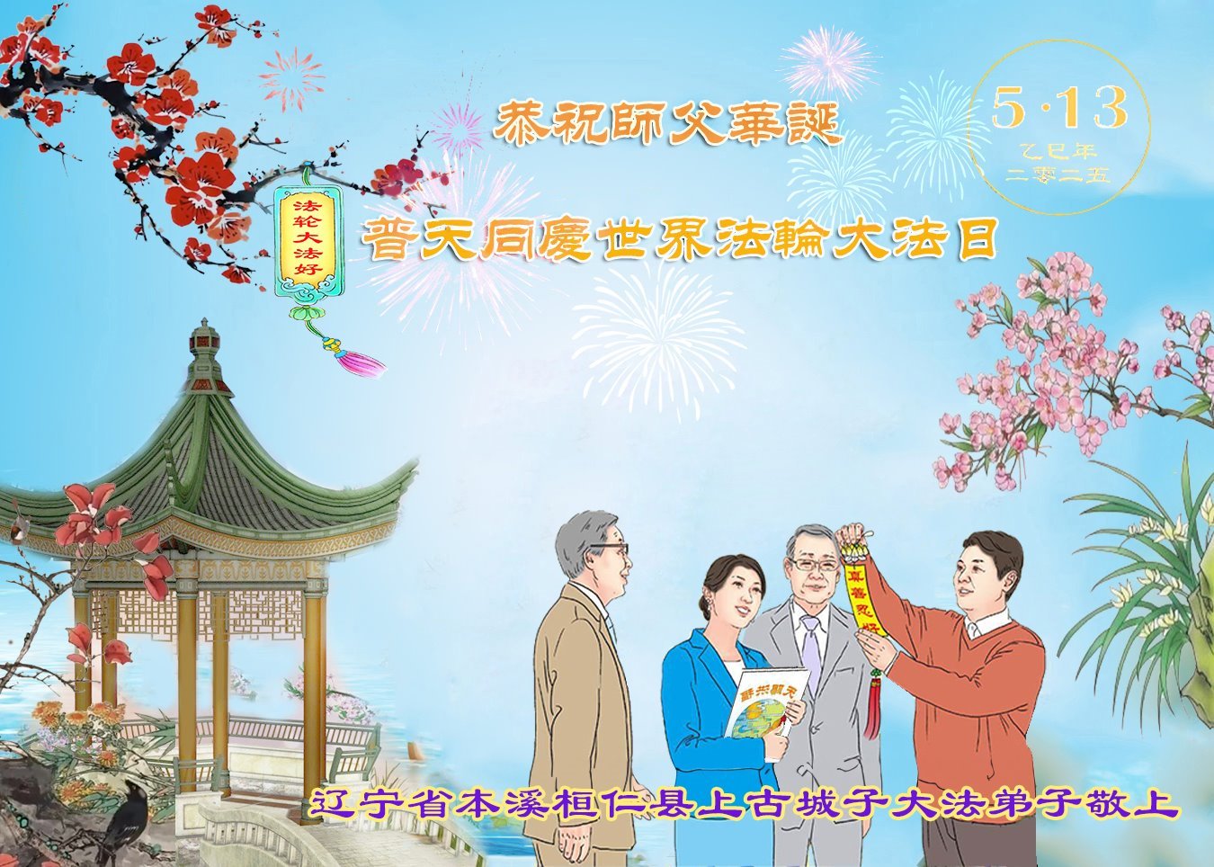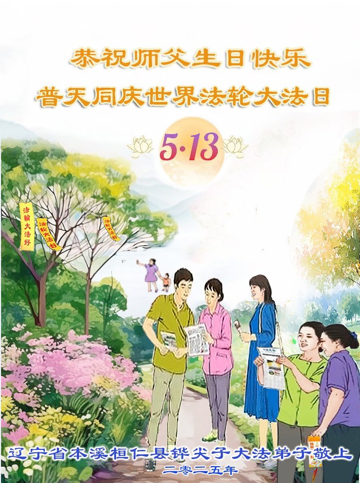 【明慧网二零二五年五月十二日】 辽宁省本溪桓仁县一学法小组大法弟子恭贺世界法轮大法日暨敬祝师尊华诞!